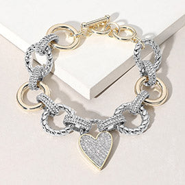 14K GOLD PLATED METAL LINK CZ STONE PAVED HEART PENDANT TOGGLE BRACELET