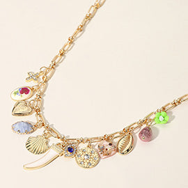 METAL SEA SHELL HEART LOCKET HORN FLOWER STONE CLUSTER CHARM STATION NECKLACE