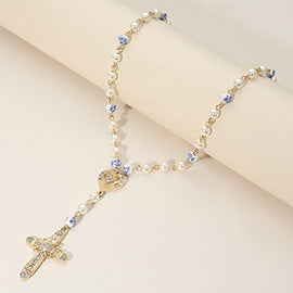 STONE PAVED CROSS PENDANT POINTED FLORAL CERMAINC BALL BEADED Y SHAPED NECKLACE