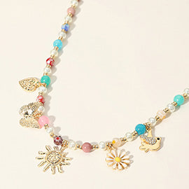SUN FLOWER BUTTERFLY HEART BIRD CHARM STATION PEARL BEADED NECKLACE