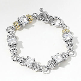 TWO TONE CZ STONE CLUSTER LINK TOGGLE BRACELET